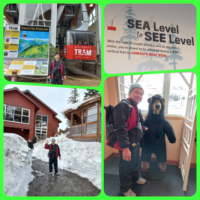 Pertama, kami ke Goldbelt Tram Alaska dulu. Ini bukan tour dengan guide ya, jadi hanya beli tiket tram nya saja lewat NCL. Harga beli langsung dengan lewat kapal sama saja, yaitu USD.49. Karena kami dapat diskon USD.50 per excursion untuk 1 orang, jadinya malah tiket Diana terhitung gratis, karena harganya kurang dari USD.50. Asik kan ?! Tiket ini juga berlaku untuk naik tram sepuasnya dalam 1 hari, jadi bisa berkali-kali naik turun kalo mau. Ini atraksi utama di Juneau sih rasanya, tram ini termasuk “one of the most vertical tramways in the world”. Jadi lumayan terjal ya.