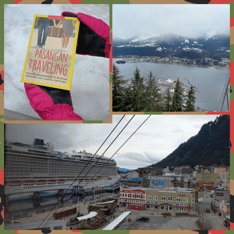 Suhu di Juneau sekitar 2-5 derajat celcius dan cuaca diramalkan cloudy. Sunrise pk.05.40 am dan sunset pk.08.15 pm. Jam di Juneau mundur 1 jam dari kota Seattle atau waktu di lautan kemarin. Informasi ini semua ada di booklet ya, jadi sudah memudahkan penumpang untuk adjust jam dan memperkirakan kostum yang mau dipakai. Di kota ini kita punya waktu sampai pk.10.30 pm, sebelum harus naik lagi ke kapal. Lumayan lama juga sih. Makanya untuk Juneau ini kami beli shore excursion dari kapal saja biar ga ribet. Ada 2 excursion yang kami pilih di Juneau ini : Goldbelt tram dan Mendenhall Glacier, yang tiketnya pas pertama sampai kamar di kapal sudah ada di atas ranjang itu.