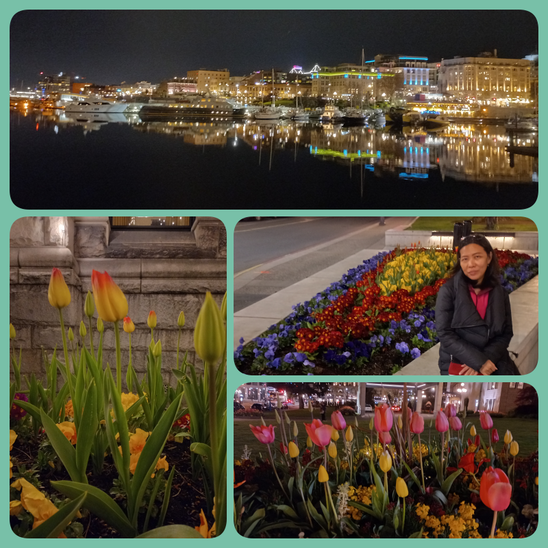 Di sebrang hotel terlihat view pelabuhan Victoria Causeway Marina. Kita bisa jalan2 ke area dermaga dan duduk2. Ada restoran dan cafe2 juga. Kami memilih jalan2 santai sambil foto2 saja. Area jalan2nya sangat kecil, radiusnya tidak sampai 1 km. Kota ini banyak sekali dihiasi bunga yang cantik2 di pinggir jalan. Tulip aneka warna juga banyak sekali yang sudah blooming. Bagus2 bangeeeeet ! Nanti pas udah sampai lagi di Seattle kami mau ke Skagit Tulip Festival. Pastinya di sana lebih puas deh liat tulipnya.