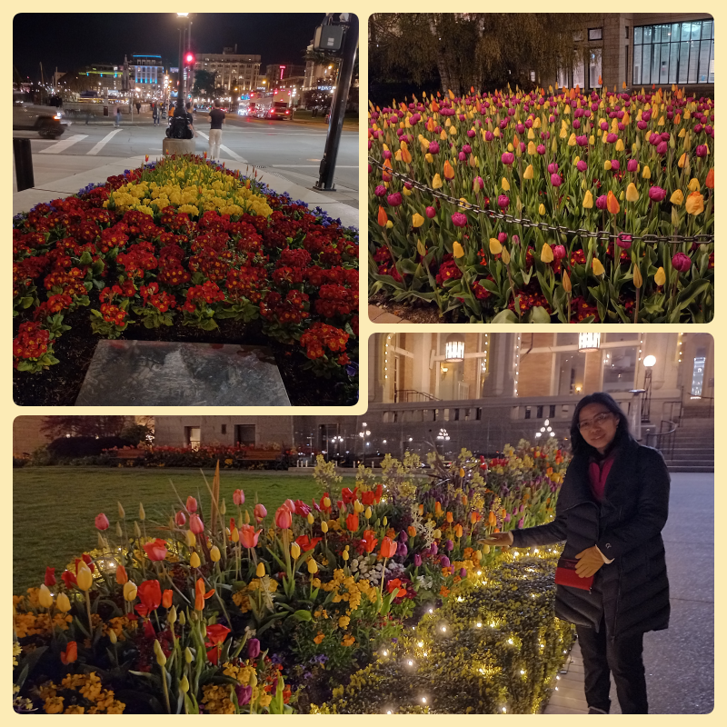 Sayang sudah malam, jadi ketika berfoto mesti pakai mode “night view” dan ditahan agak lama supaya hasilnya bagus. Walau begitu tetap saja kelihatan gelap malamnya ya. Jika hari terang pasti lebih kelihatan cantik bunga2nya. Sebagai tambahan info, salah satu tempat wisata yang terkenal dengan keindahan bunganya di Victoria ini adalah Butchart Garden. Kami juga sebetulnya ingin ke sana, tapi waktu tidak memungkinkan. Ya sudahlah, toh kami sudah pernah pergi ke Garden of Morning Calm saat trip ke Korea Selatan (2017). Ini tiruannya Butchart Garden lah, mirip banget.