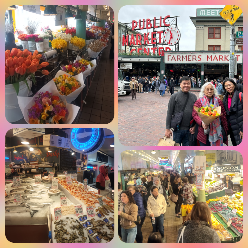 Cerita panjangnya antrian di sini sudah sangat terkenal, apalagi weekend. Tapi karena kesempatannya sekarang, ya apa boleh buat, kita jalani saja. Kami ketemu juga rombongan turis Indonesia yang justru baru mau naik cruise hari tsb. Kami antri sekitar 1 jam di trotoar, sebelum akhirnya bisa masuk ke storenya yang ternyata memang kecil. Saat antri, sepupu Diana datang jemput. Jadi koper bisa masuk ke mobil mereka dulu, supaya nanti bisa jalan2 bareng menjelajah Pike Place Market.
