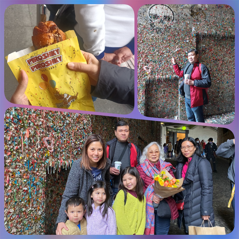 Tidak jauh dari Pike Place, terdapat salah satu tempat turis paling ‘menjijikan’ yang pernah kami datangi, yaitu The Gum Wall. Di kanan dan kiri kami, ada dinding yang penuh ditempeli permen karet (gum). Ini permen karet bekas ya, yang sudah dikunyah orang lalu ditempelkan ke dinding. Euuuuuh….