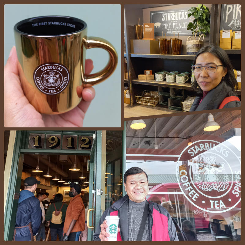 Selain itu kami juga membeli beberapa merchandise seperti tumbler, gelas, dan mug, baik untuk sendiri maupun titipan teman/family. Merchandise di sini adalah khas “First Starbucks Store” dan tidak bisa ditemukan di outlet Starbucks lainnya. Di bagian kiri toko ada rak berisi display merchandise dan juga aneka kopi bubuk yang sudah dikemas. Di area ini juga pengunjung bisa menunggu pesanan kopi yang sedang dibuat.
