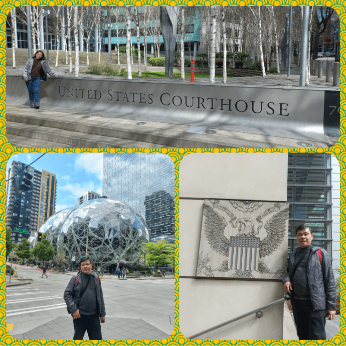 Sekarang kami mau ke kantor pusat Amazon yang juga disebut Spheres karena bentuk bangunanya seperti bola kaca raksasa. Keren ya Seattle ini, banyak brand besar yang diawali atau berpusat di sini. Siapa yang tidak kenal Starbucks, Boeing dan Amazon coba ? Dalam perjalanan, kami melewati gedung United States Courthouse jadi foto2 dulu.