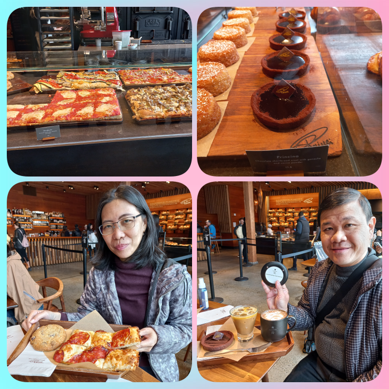 Jangan lupa memesan aneka kue/snack yang ada di sini. Semuanya enak2 dan disajikan dalam keadaan fresh. Jadi selain jual kopi, di sini juga ada bagian bar nya dan ada bagian bakery nya. Kami beli kopi Oleato Iced Cortado dan Dark Chocolate Mocha (tapi ini espresso ya). Lalu cobain princina, ini ganache coklat yang enaaaak banget, signaturenya mereka. Lalu ada beli juga pizza (ini juga enak) dan Choco Chip Cookie (ini standard aja).