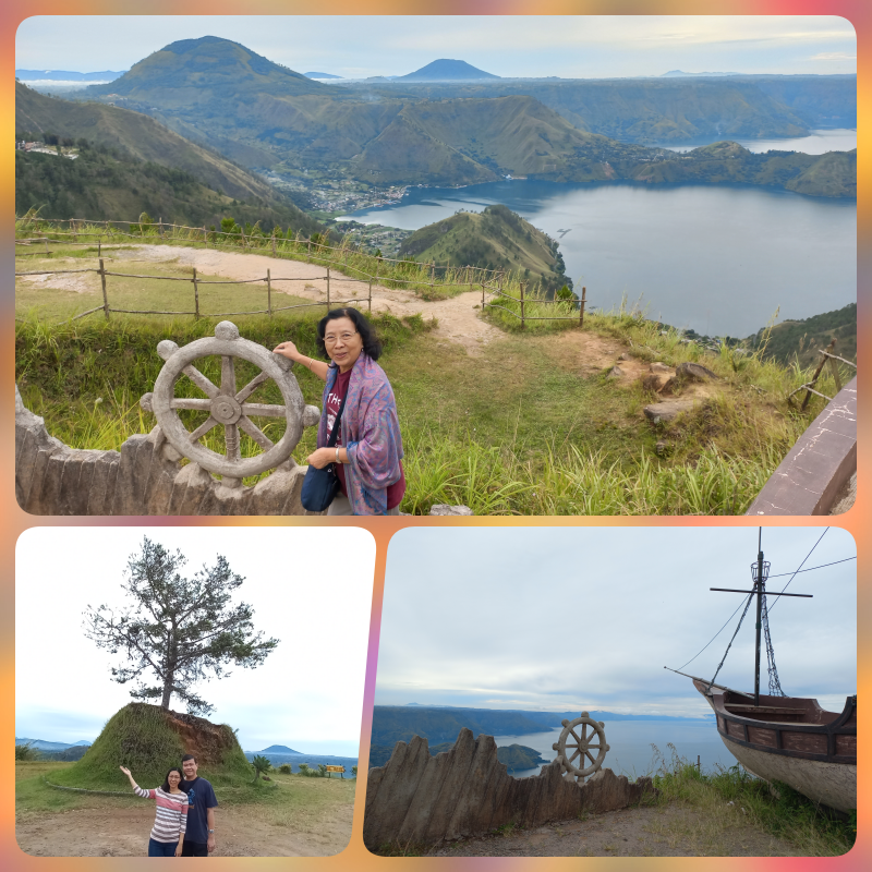 Kapal di One Tree Hill dengan latar belakang Danau Toba