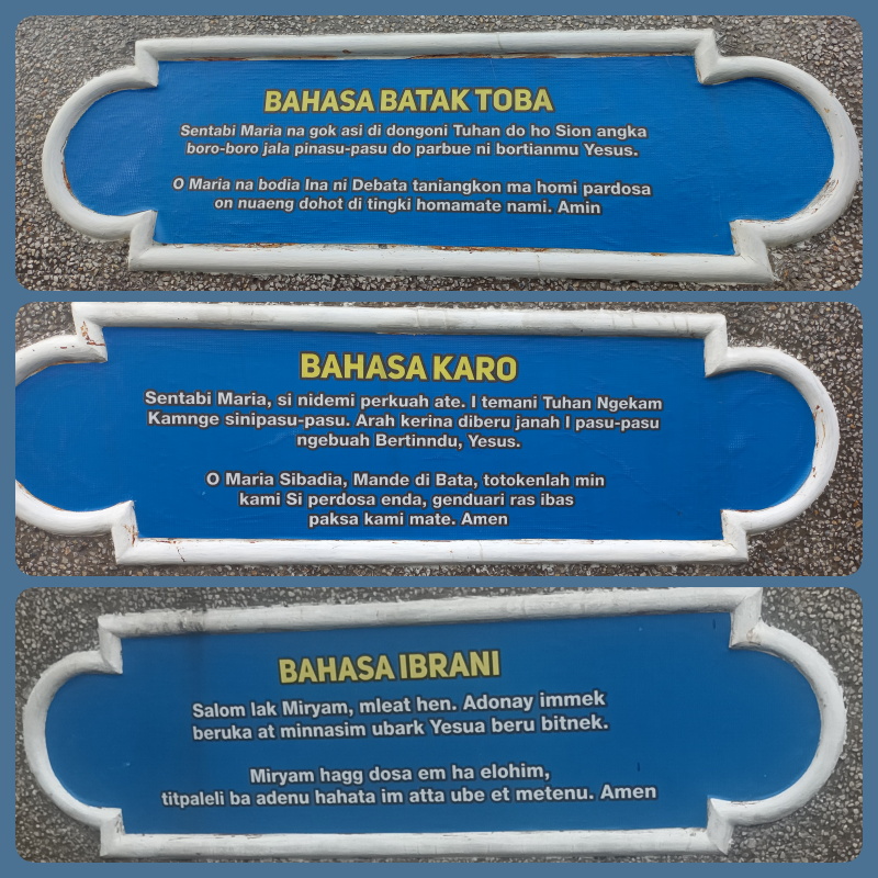Di sepanjang dinding tangga luar yang menuju lantai 2, terdapat kutipan doa salam Maria dalam berbagai bahasa, baik bahasa Indonesia, bahasa lokal Sumatera Utara (Karo, Batak Toba, Simalungun, Dairi dll) hingga bahasa asing (Ibrani, Yunani, Arab, dll)