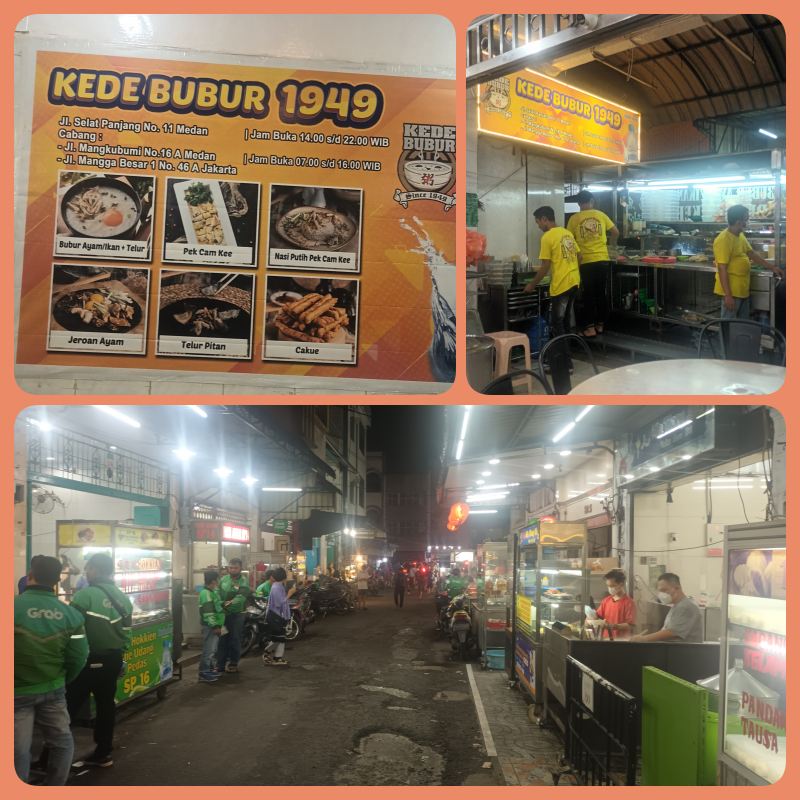 Jalanannya tidak terlalu panjang, lebarnya hanya bisa dilewati 1 mobil saja. Di kanan kiri banyak resto makanan, mayoritas tidak halal. Kami memilih makan di Kede Bubur 1949 yang ternyata juga sudah punya cabang di Jakarta.