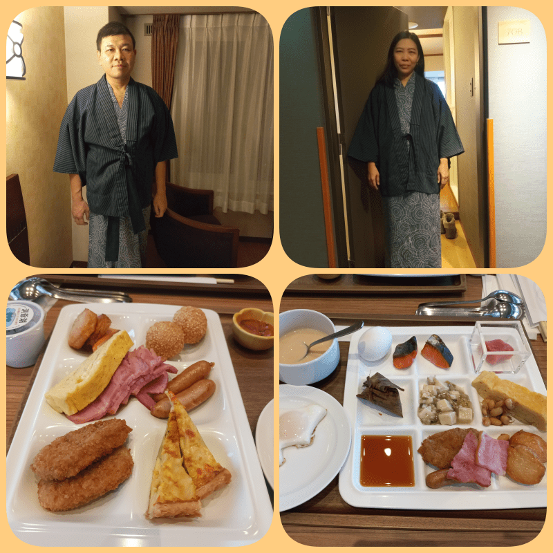 Atas : kimono di hotel, bawah : breakfast