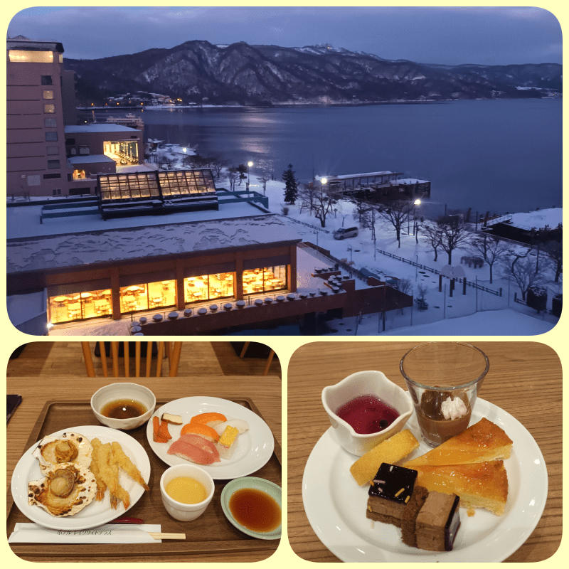 Atas : Lake Toya malam hari, bawah : dinner kami di hotel