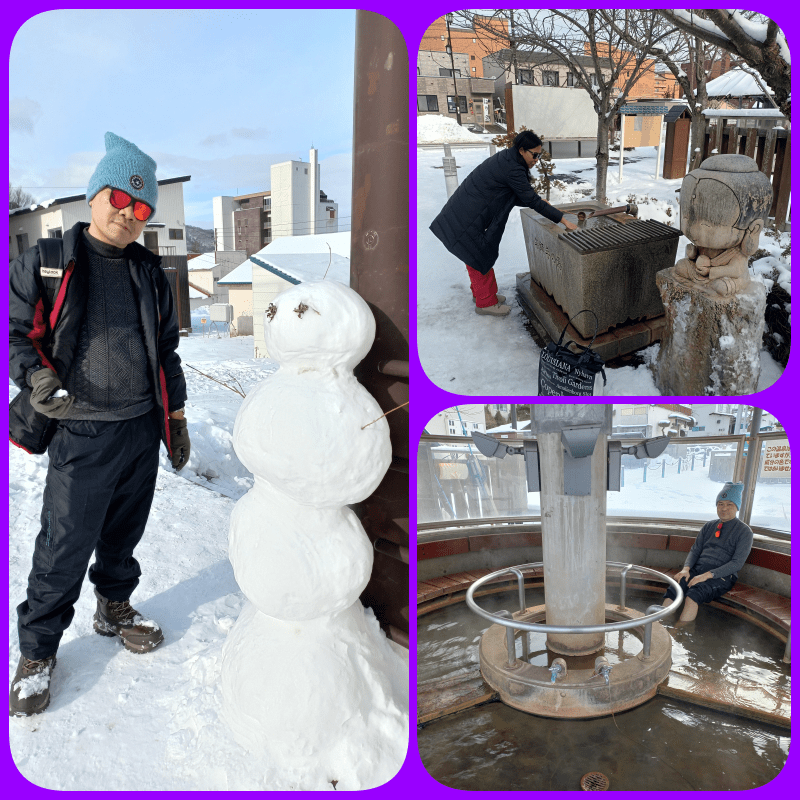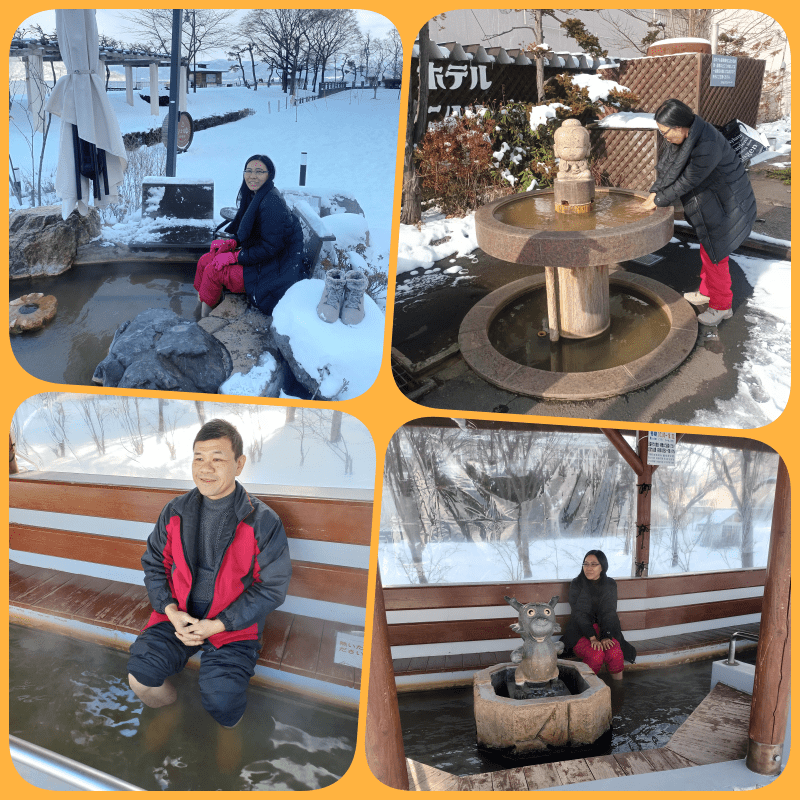 Tiap foot bath dan hand bath, punya nama dan filosofinya masing2. Ada keterangannya dalam bahasa Jepang dan Inggris biasanya. Ada yang untuk kesehatan, ada yang untuk pernikahan, macem2. Kami menggunakan tourist map untuk menemukan tempat-tempat ini yang tersebar di penjuru Lake Toya. Mesti bawa handuk sendiri ya, terutama jika mau cobain foot bath. Enak sekali loh merendam kaki dan tangan di air panas di tengah winter begini. Kami puas banget melakukannya !