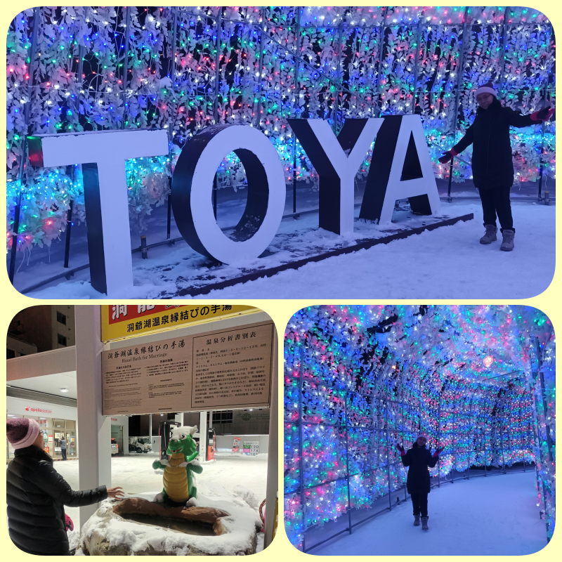 Ada yang mampir ke toko souvenir maupun convenient store. Jalanan bersalju sehingga perlu berhati-hati saat melangkah. Di seberang hotel, ada Toya Illumination seperti di Hokkaido Japan part 1 ; Sapporo Tapi ini jauh lebih kecil dan sederhana ya, ga bisa dibandingkan dengan yang di Sapporo. Sambil jalan, kami menemukan beberapa hand bath yang bisa langsung digunakan secara free oleh pengunjung yang lewat. Enak juga merendam tangan dengan air panas di tengah dingin winter begini.