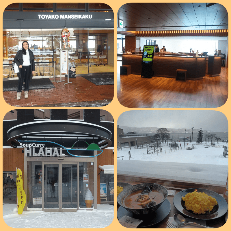 Nah karena sudah siang dan lapar, akhirnya kami memutuskan untuk makan di resto Soup Curry HLahal (nah gimana bacanya ya). Cari yang hangat2 dekat hotel. Kami memilih tempat duduk yang tepat menghadap Lake Toya. Sambil kami lunch, cuaca mulai berubah menjadi cerah, jadi view danau nya terlihat indah.