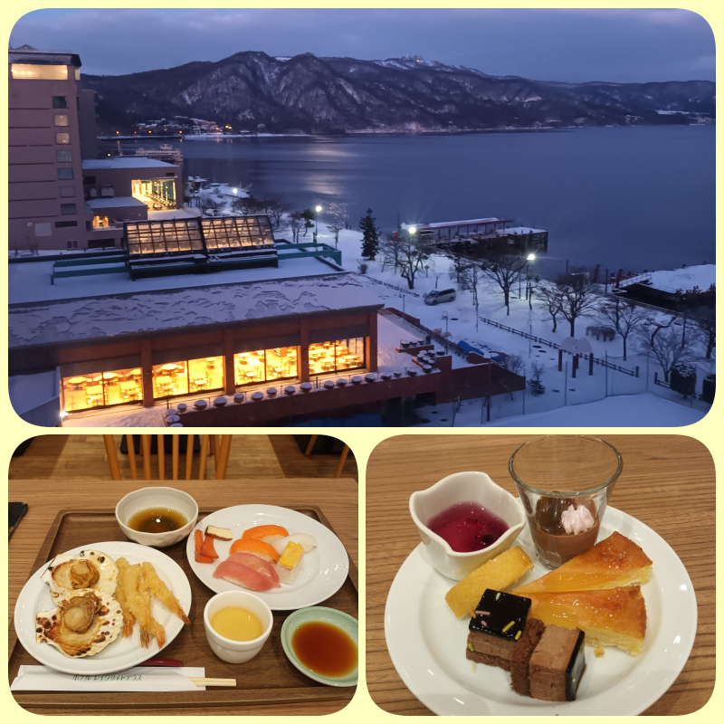 Atas : Lake Toya malam hari, bawah : dinner kami di hotel