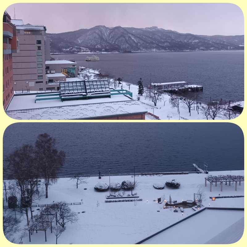 Setelah breakfast dan masih ada waktu, Jeff memutuskan untuk onsen kembali. Seperti diceritakan sebelumnya di atas, untuk pagi hari ini, onsen pria menggunakan Hoshi No Yu yang letaknya di lantai paling atas hotel ini. Untung disengajakan onsen, karena ternyata pemandangannya spektakuler menghadap Lake Toya.