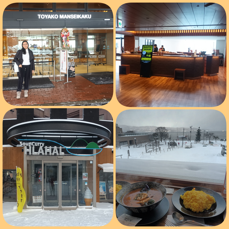 Nah karena sudah siang dan lapar, akhirnya kami memutuskan untuk makan di resto Soup Curry HLahal (nah gimana bacanya ya). Cari yang hangat2 dekat hotel. Kami memilih tempat duduk yang tepat menghadap Lake Toya. Sambil kami lunch, cuaca mulai berubah menjadi cerah, jadi view danau nya terlihat indah.