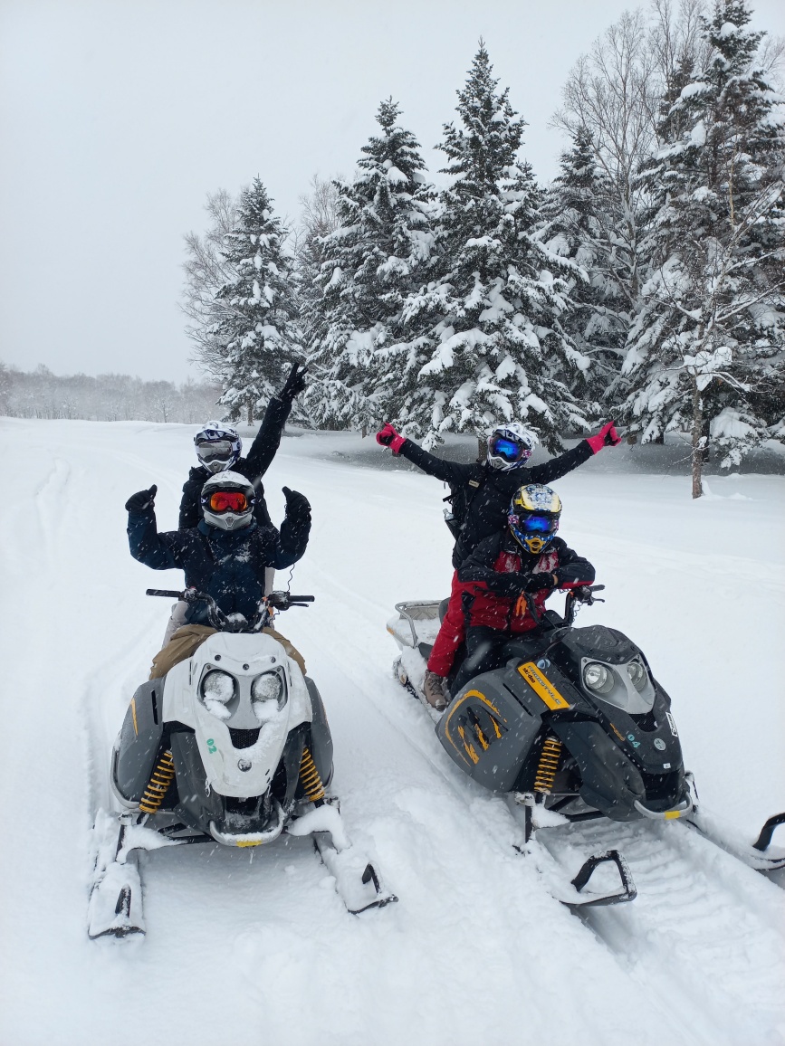 Ternyata kami tidak boleh mengendarai snowmobile sendirian karena bisa nyasar dan berbahaya ketika melintasi salju baru. Bersama kami, ada satu instruktur yang mengajari dan memimpin kami di depan alias membuka jalan. Di samping itu, ada juga 1 pasang dari Malaysia yang bersama kami. Enak banget ini, semi private jatuhnya, very small group. Jadi betul2 puas !