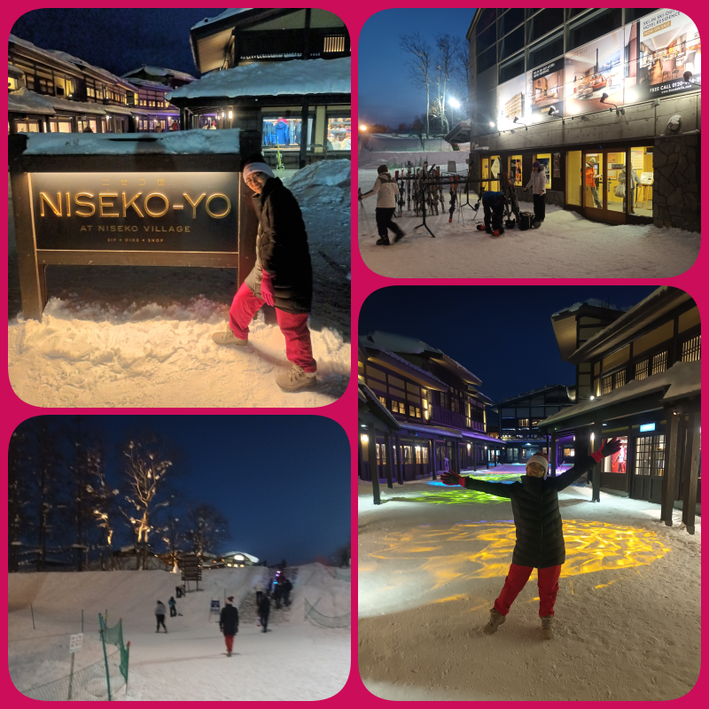 Di resort, sebenarnya disediakan beberapa menu dinner berbayar yang dimasak oleh istri Mr. Dave. Tapi kami mau makan malam sekaligus jalan-jalan saja. Mr. Dave info keramaian adanya di Niseko Village dan dia bisa antarkan kami. Di sini ada beberapa toko perlengkapan ski dan beberapa resto. Walaupun sudah malam dan gelap, masih ada beberapa aktivitas yang masih berlangsung seperti night ski maupun snowboarding dari atas bukit.