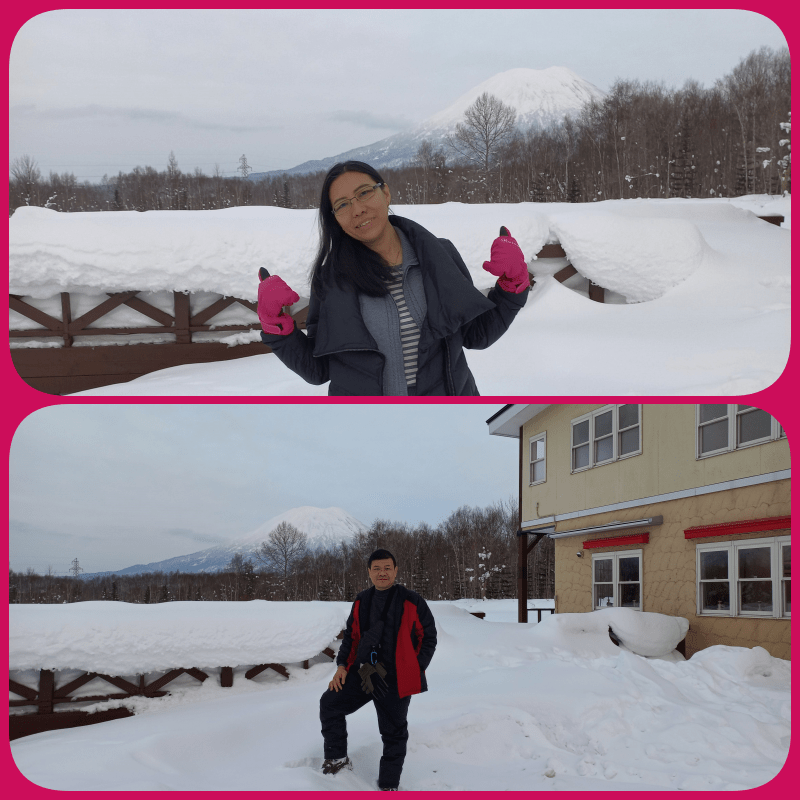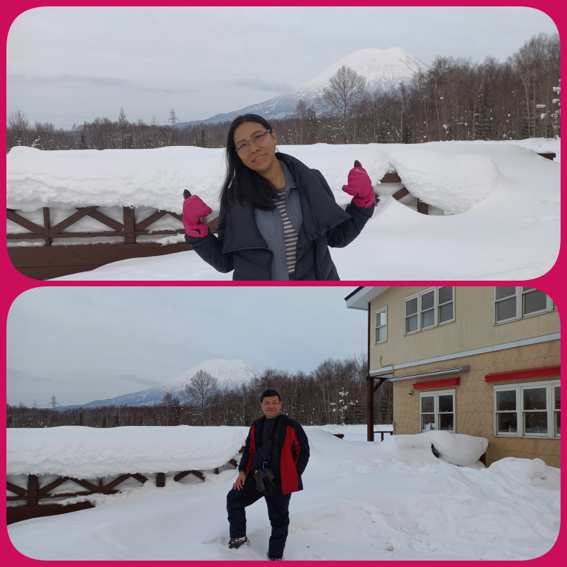 Resort Inn Niseko ini berbentuk rumah tinggal yang kamar-kamarnya diubah menjadi kamar tamu hotel. Tetangganya salju tebal semua nih, betul-betul alami dan menyenangkan untuk kami yang berasal dari negara tropis. Jadi seperti di film-film, dimana pemandangan dari rumah itu putih semua. Di belakang Resort Inn Niseko terdapat Mt. Yotei yang berdiri megah (miniaturnya Mt. Fuji). Karena cuaca cerah jadi gunungnya terlihat cukup jelas. Bagus ya !