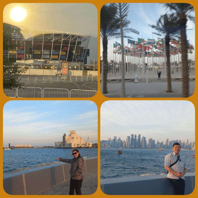 Dari airport ke kota Doha sekitar 15 menit. Jalanan kota Doha lebar dan tidak macet. Kami baru tahu ternyata sehari sebelumnya, Qatar baru saja merayakan National Day mereka sehingga di sepanjang jalan banyak dikibarkan bendera Qatar. Suasana kota Doha rapi dan bersih. Perhentian pertama adalah Doha Corniche. Dari sini kami bisa melihat gedung2 pencakar langit yang ada di SCBD Doha yang dipisahkan oleh Teluk Arab. Nantinya, dari sini kami akan melewati SCBD tersebut saat menuju Katara Cultural Village.