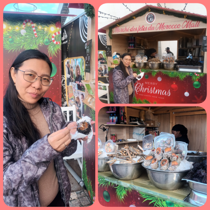 Morocco Mall berisi toko dan butik2 dengan merk international, sama seperti yang ada di mall2 kelas atas di Jakarta. Di bagian luar mall ada bazaar yang menjual produk dan makanan dalam rangka Christmas. Salah satu yang menarik adalah stand yang menjual makanan bulu babi seperti yang Diana makan dalam gambar di atas.