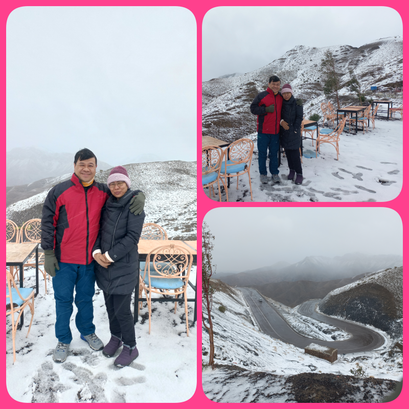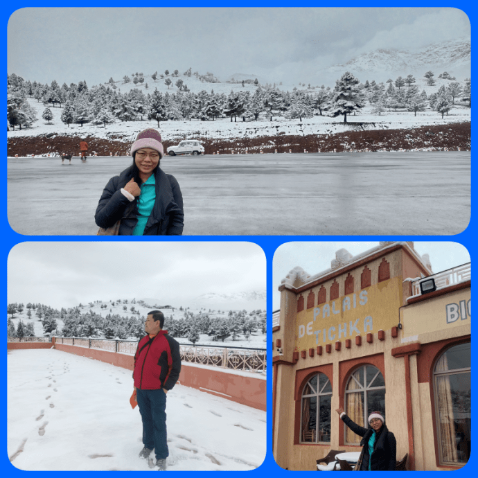 Setelah melewati dataran kering dan berwarna coklat, tiba2 kami sudah mulai memasuki area Atlas Mountains dengan suasana serba putih ! Ini mengingatkan akan pengalaman kami saat mengunjungi Yukon-Canada di April 2023. Wah keren banget, tidak menyangka ada bagian dari Morocco dengan suasana salju seperti ini.