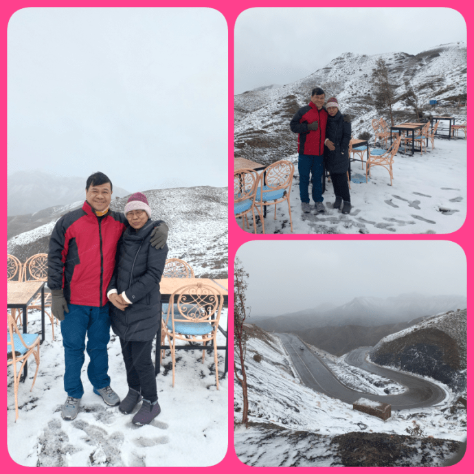 Kami sempat turun di salah satu titik dan rest area untuk merasakan hujan salju dan dingin dari tiupan angin yang sangat kencang. Kami sampai kesulitan berjalan karena kencangnya angin. Driver kami, Abdel mengatakan bahwa tidak tentu ada salju di bulan Desember. Jadi dia pun ikut menikmati suasana salju di sini.