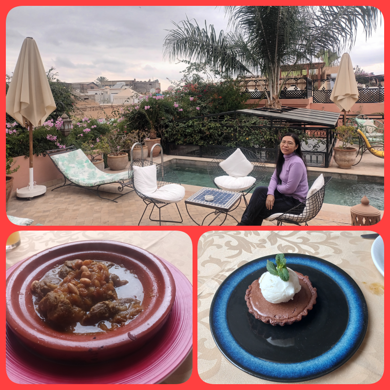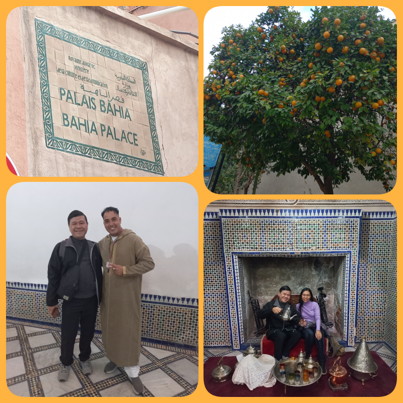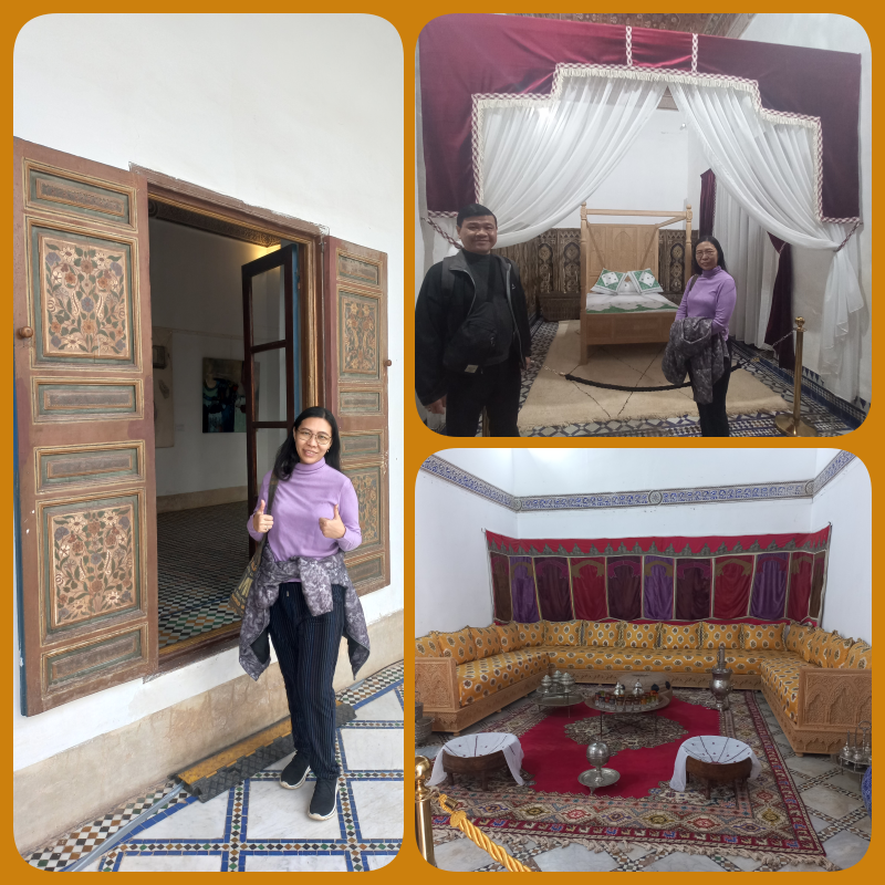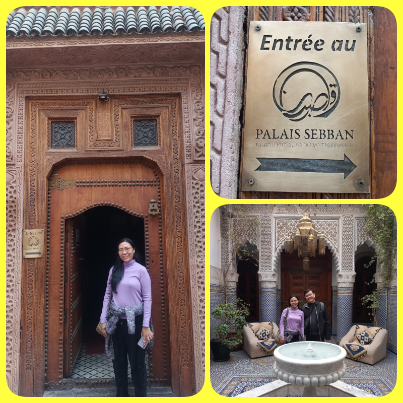 Tidak terasa waktu sudah melampaui jam makan siang kami. Kami diajak makan siang (biaya sendiri) di Palais Sebban. Ini hidden gems buat kami karena melalui pasar dan jalan2 kecil di sekitaran Old Medina. Saat kami tiba, pintu masuknya biasa saja layaknya rumah biasa. Tapi begitu masuk ke dalamnya, kita langsung terpukau dengan tempat ini. Ternyata tempat ini adalah hotel dengan eksterior dan interior layaknya sebuah istana. Dan tempat seperti ini ternyata bukan satu2nya di Marrakech, masih ada banyak di sekitaran Old Medina.