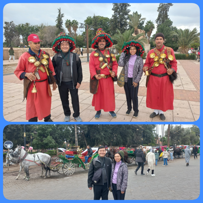 Selanjutnya kami diajak menyeberang jalan melewati Djemaa el Fna Square, alun2 terbesar di Morocco dan masuk dalam UNESCO Intangible Cultural Heritage sejak tahun 2001. Di pintu masuk Djemaa el Fna Square, ada penyewaan delman untuk yang mau keliling Marrakech.