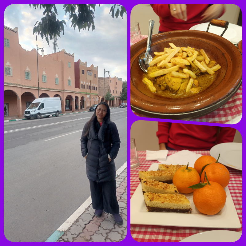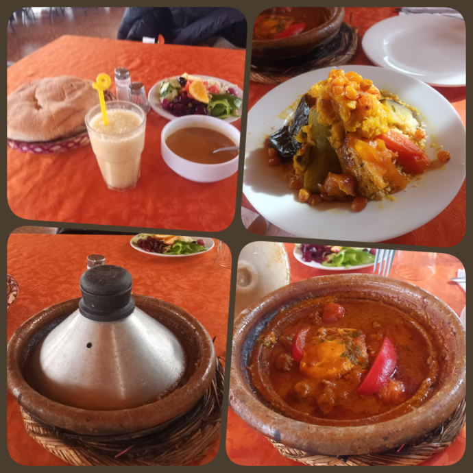 Seperti biasanya, selalu disuguhkan roti2 keras dan tebal ala Perancis. Appetizer salad atau sup, kemudian main coursenya yaitu couscous dan tagine, terakhir ditutup dengan dessert (bisa berupa buah/kue). Kebanyakan buah yang disajikan selama kami di Morocco adalah pisang dan buah jeruk. Jadi tagine itu secara umum rasanya gurih dengan bumbu kental seperti bumbu rendang. Lalu sup maroko itu seperti goulash rasanya, jadi bukan cream soup.