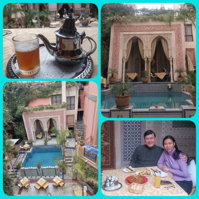 Untuk minumannya, kami pesan Moroccan Whiskey alias mint tea. Ini non alkohol ya, betulan hanya teh, kan Morocco merupakan negara Islam. Namanya saja yg pake kata “whiskey”. Mint tea ini juga salah satu minuman yang umum dan sangat mudah ditemui di seluruh Morocco. Cara penyajiannya seperti menuang teh tarik yaitu teko diangkat setinggi mungkin dan dituangkan ke gelas. Setelah makan, kami keliling melihat kamar2 hotel yang ada. Suasananya sangat khas Morocco dan harganya pun tidak terlalu mahal.