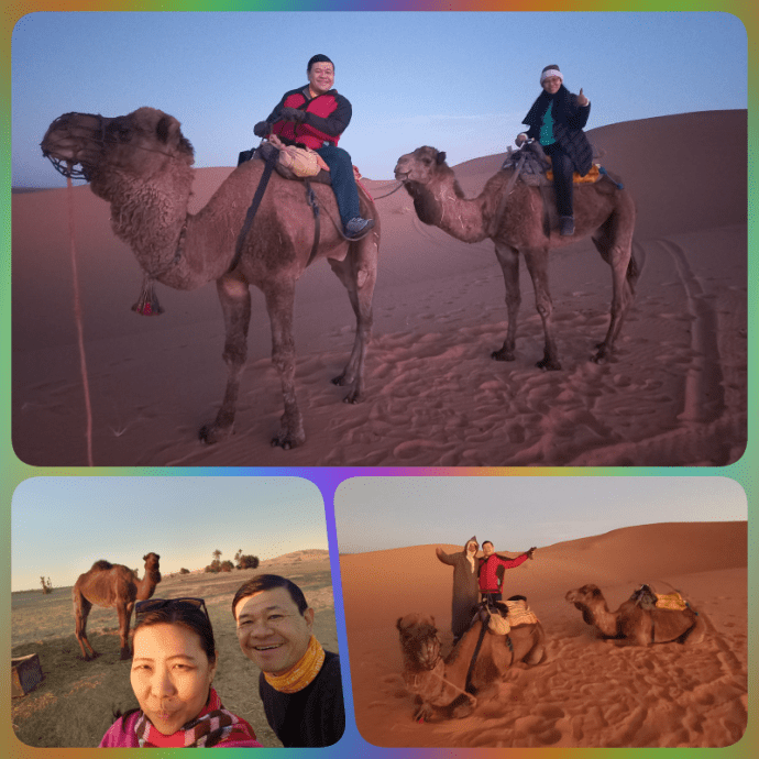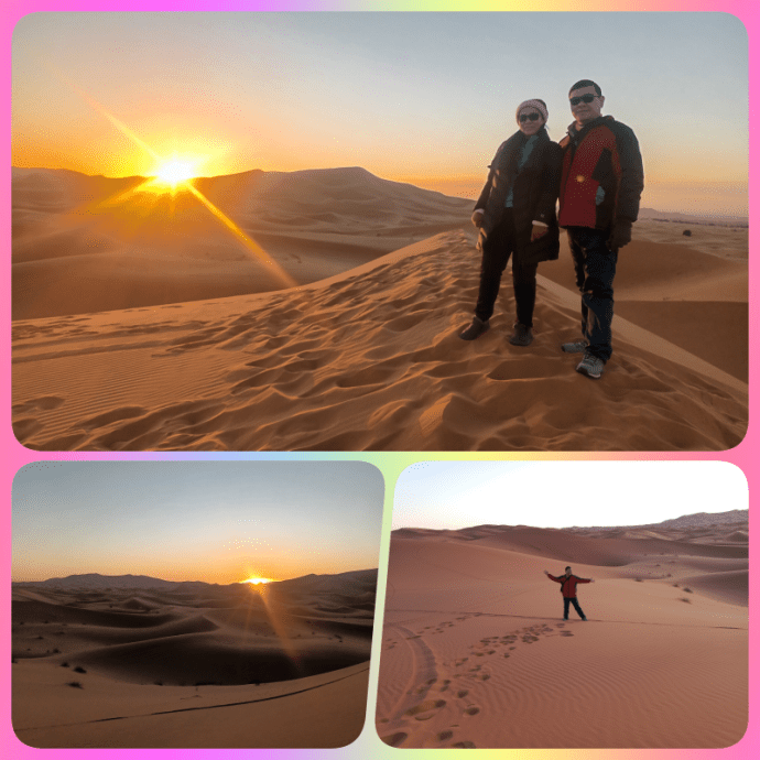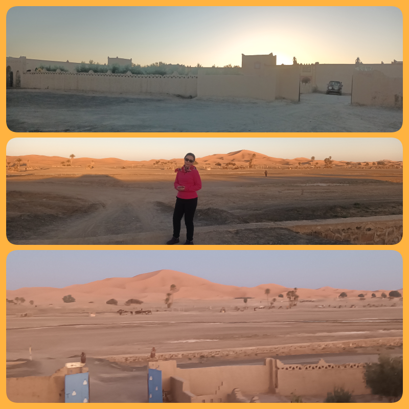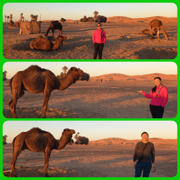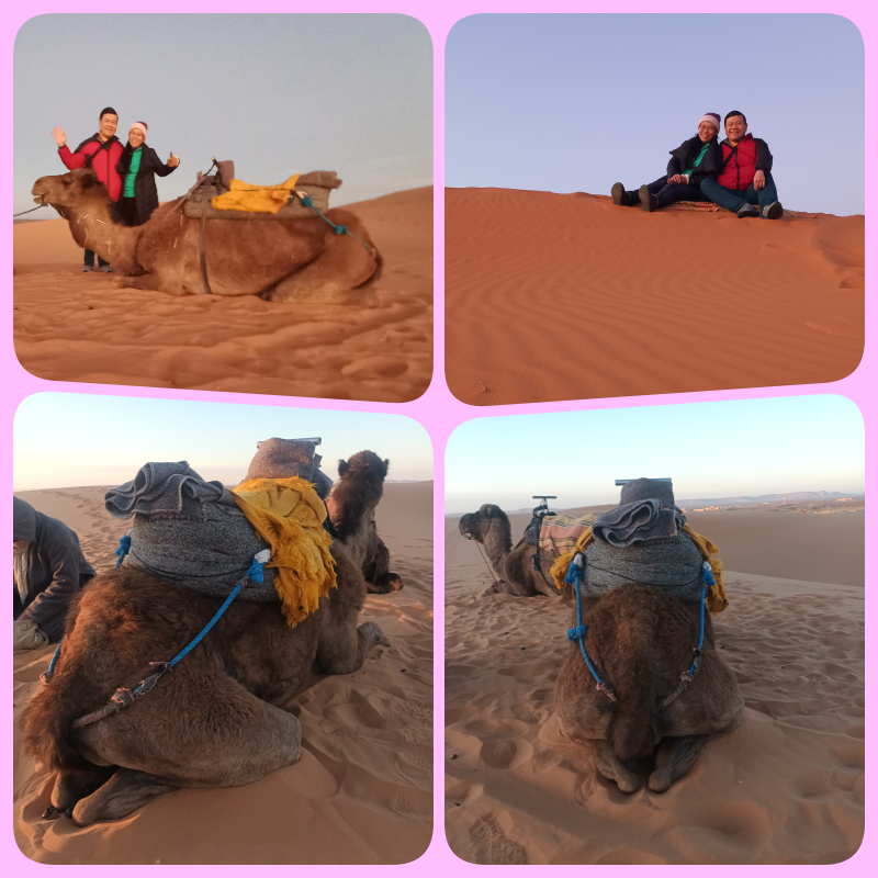Walaupun sudah jam 6 sore, cuaca masih cerah. Kami jalan2 ke luar hotel mendekati kemegahan gurun Sahara di depan kami. Di depan hotel, ada banyak unta yang diikat. Sepertinya unta tunggangan para turis. Di kejauhan, ada orang2 yang naik jeep 4×4 dan motor trail menaiki dan menuruni kontur gurun Sahara. Ini udaranya tetap dingin ya, makanya kami masih pakai mantel. Jadi gurun itu tidak identik dengan suhu yang panas.
