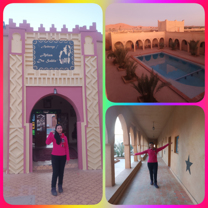 Merzouga adalah sebuah kota kecil di Morocco yang berada di gurun Sahara dan berbatasan dengan Aljazair. Di Merzouga ada beberapa hotel dan penginapan. Penginapan kami hotel Atlas Du Sable termasuk hotel lama. Di depan hotel kami terhampar gurun Sahara yang berwarna orange di sore hari itu.