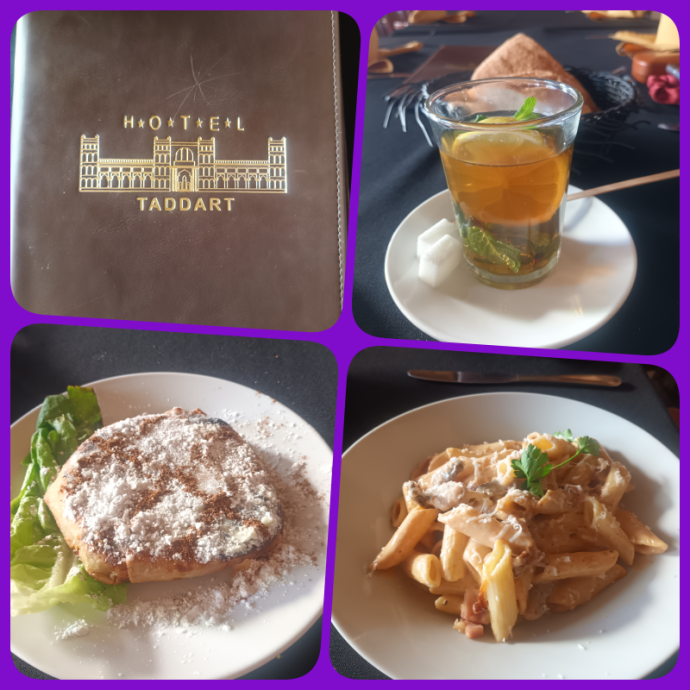 Dalam perjalanan menuju kota Fes, kami makan siang di hotel Taddart. Sebelumnya kami sudah minta bantuan driver kami agar kami tidak ditawari lagi menu lokal seperti tagine. Kami mau yang lebih western kali ini karena walau enak dan awalnya ketagihan, kalo sudah berhari-hari ya bosan juga makan tagine terus. Jadilah kali ini kami pesan penne carbonara dan pastilla. Pastilla ternyata merupakan salah satu makanan khas Morocco. Bentuknya semacam pie / pastry. Atasnya ditaburi gula halus putih. Isinya suwiran daging ayam yang sudah dicampur beberapa bumbu rempah. Pas dimakan, isinya mirip kayak isi lemper ayam di sini. Tapi kulit luarnya pastry manis gitu. Secara umum pastilla ini rasanya seru dan sangat enak.