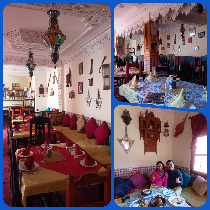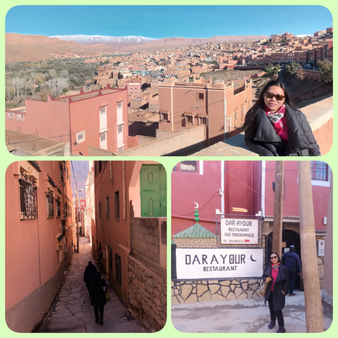 Selesai foto2, kami diajak lunch di salah satu restoran lokal dekat situ. Tempatnya hidden gems. Dari jalan raya, kami harus berjalan kaki sekitar 100 meter masuk ke dalam gang. Akhirnya tibalah kami di Dar Ayour, restoran yang memiliki view Todra Gorges dan sungai di belakangnya.