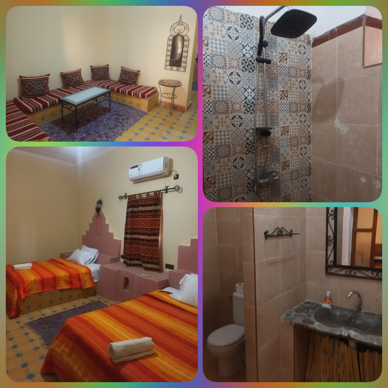 Karena hotel kami kali ini berlokasi di gurun Sahara, interior kamarnya berbeda dengan kamar2 hotel di kota. Ruang tamunya besar dengan bantal2 untuk sandaran di sofanya. Interior Morocconya sangat terasa. Airnya kurang jernih, agak kotor. Maklum di tengah2 gurun, air sulit didapatkan.