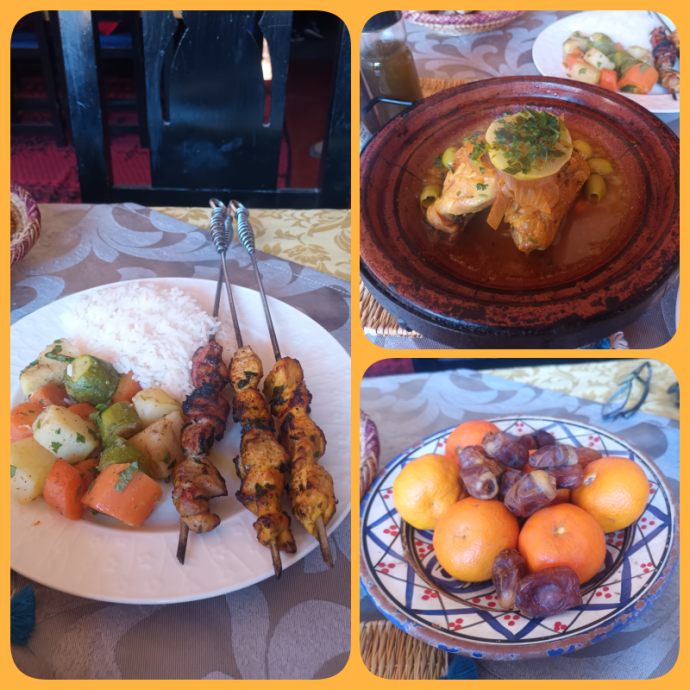 Seperti biasa, untuk lunch sudah ada paket dengan 150 MAD per orang. Ada menu chicken tagine yang kami pilih, lalu cobain sate kambing dan ayam. Untuk buahnya kali ini selain ada jeruk, disajikan juga kurma Morocco yang rasanya manis.