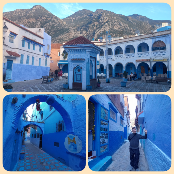 Setelah makan siang, kami beranjak ke kota Chefchaouen, sebuah kota kecil di pegunungan Rif. Kota ini dikenal dengan sebutan Blue City atau Kota Biru. Dari kejauhan, kami sudah bisa melihat warna biru yang ada di kota ini.