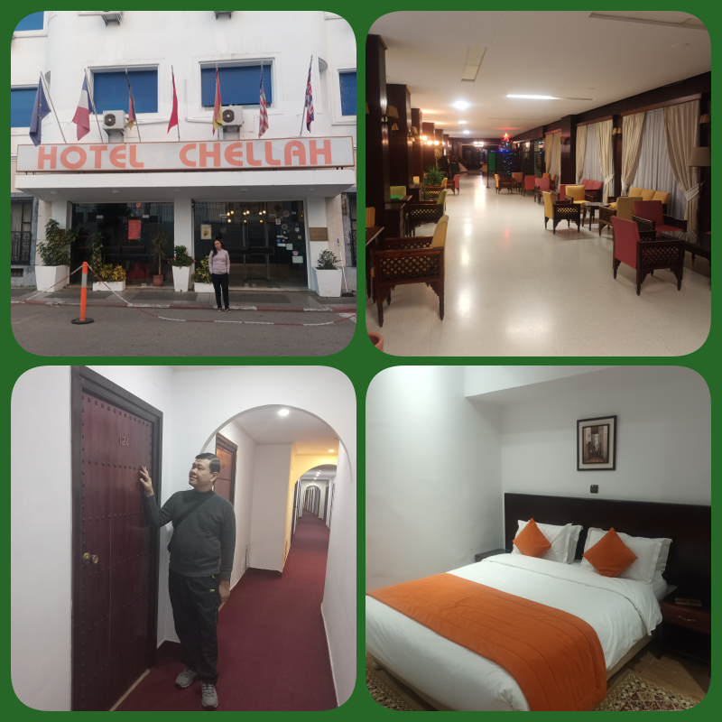 Di Tangier, kami menginap di sebuah hotel tua, yaitu Hotel Chellah. Letaknya di tengah kota. Hotel ini sudah ada sejak tahun 1964 ! Pintu kamar hotel kami terbuat dari kayu yang berat dan berukuran lebih besar daripada ukuran pintu normal pada umumnya. Dari semua hotel yang kami inapi di Morocco, hotel Chellah ini memiliki luas kamar yang paling besar. Namun begitu, justru amenities di hotel ini yang paling minim.