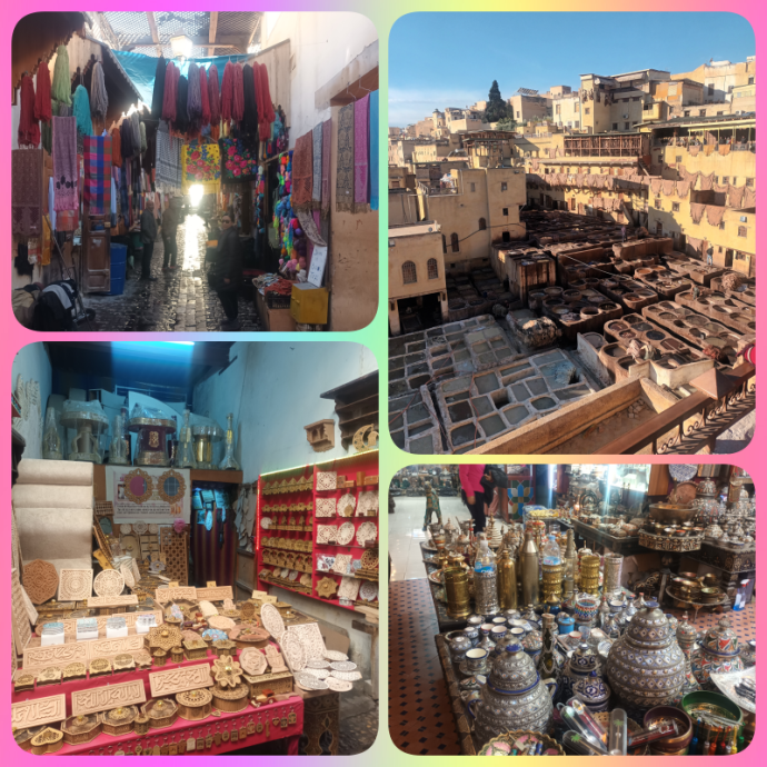 Dari pabrik keramik, kami diajak ke tempat pencelupan dan produksi kulit di Fes. Proses pencelupannya masih tradisional (menggunakan tenaga manusia). Untuk warnanya mereka menggunakan pewarna alami agar tidak mencemari lingkungan. Sebelum masuk ke toko dan workshopnya, kami diberi daun mint untuk menetralisir bau kulit yang bisa saja membuat pengunjung mual.
