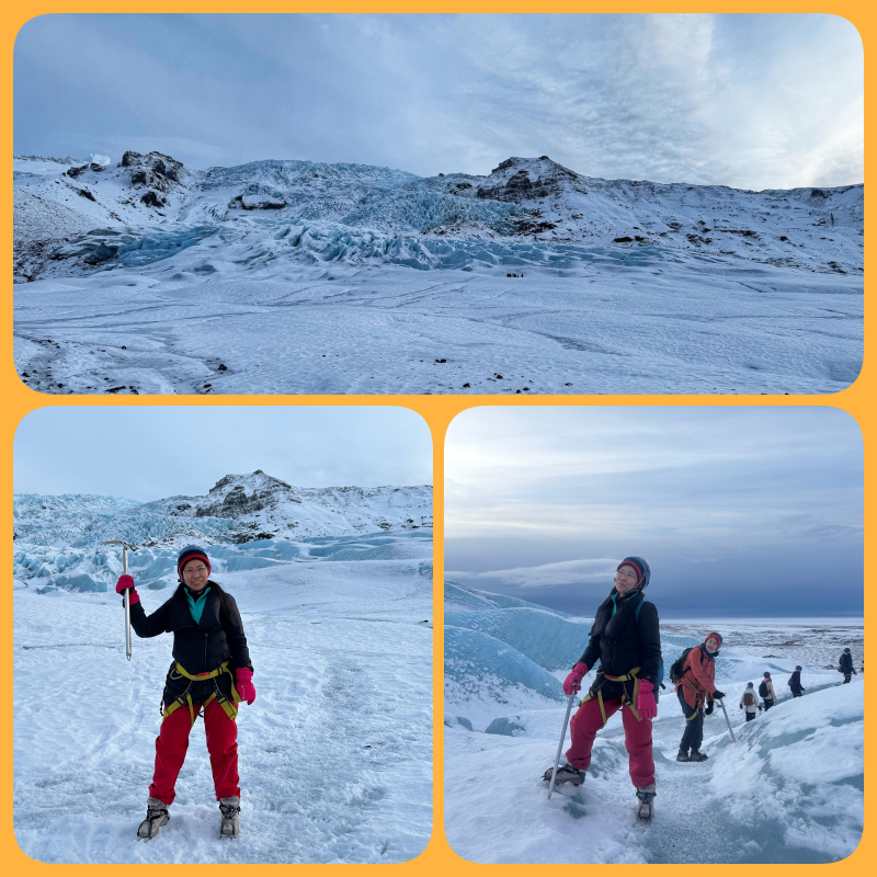 Selesai makan, kami naik bus menuju Solheimmajokull. Salah satu glacier yang ikonik dan terkenal di Iceland. Bisa dicapai dengan berjalan kaki sekitar 30 menit, jalannya pun cukup datar. Masalahnya bukan di rute hiking kali ini, tapi di jalanan penuh es tebal, sementara kami menggunaan crampon/spike yang tajam. Alhasil es2 tersebut nempel2 di crampon menjadi tebal dan serasa pakai sepatu hak nih, haha. Diana mencoba mengikis es2 tersebut, tapi karena menggumpal dan keras tentu tidak mudah. Mau lepas crampon kuatir terpeleset, serba salah nih.