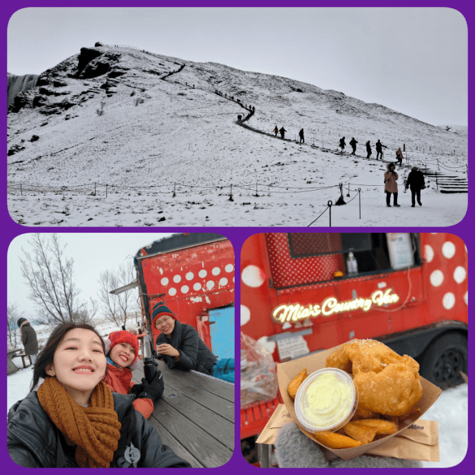 Setelah kaki cukup pegal naik dan turun tangga, saatnya istirahat dan makan siang. Ada fish & chips yang terkenal enak di sini, namanya Mia’s Country Van. Dari air terjun Skogafoss ini jalan kaki sekitar 10-15 menit lah. Bentuknya food truck gitu, makannya di picnic table di depannya. Open air ya, untungnya ga lagi salju, cuma dingin angin aja nih. Rasanya memang enaaaak ! Ada berbagai saos dan garam yang bisa ditambahkan sendiri, sangat menarik. Porsi lumayan besar, bisa sharing berdua.