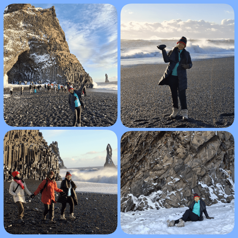 Kami dan para pengunjung yang sedang berfoto2 di pantai pun berkali2 teriak sambil lari2 menjauhi lautan karena ombak yang ganas tersebut. Dari sini juga akan terlihat Reynisdrangar (sea stacks) di kejauhan dan menjadi background foto yang unik karena posisinya cukup dekat dari bibir pantai.