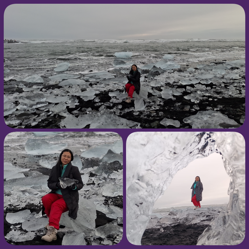 Dari sini kami bergeser sedikit (tetap naik bus) menuju Diamond Beach. Pantai ini terkenal karena sebaran bongkahan es yang relatif lebih kecil2 dan mengkilap di pasir pantai yang hitam. Itulah kenapa dianggap seperti berlian dan dinamakan diamond beach. Bongkahan es ini adalah pecahan dari glacier yang mengalir ke laut. Di sini kami bisa mencari sendiri diamond yang disukai dan berfoto dengan pemandangan yang unik dan tidak ada di tempat lain.