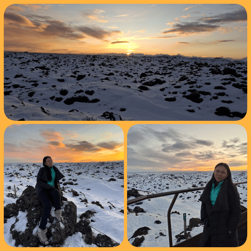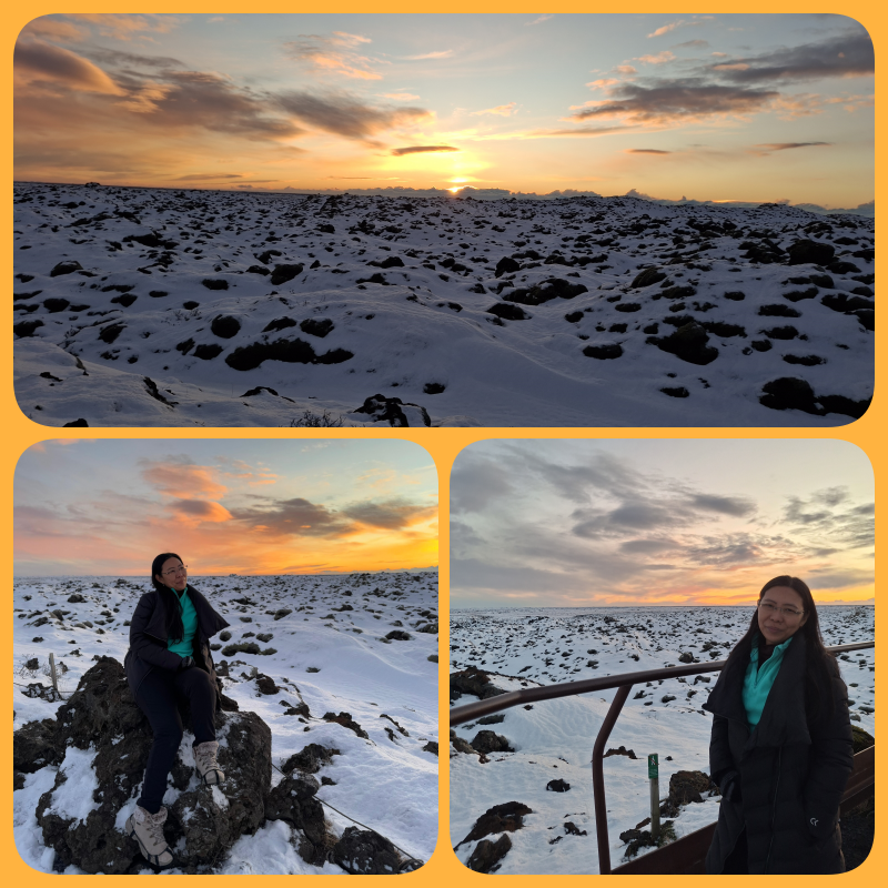 Wilayah ini sebetulnya ditutupi lumut hijau tebal yang menjadikannya unik. Namun ketika winter, tentu saja yang terlihat adalah padang lava ini ditutupi putihnya salju. Di sini pun kami kembali bisa merasakan cantiknya sunrise di tengah pemandangan alam yang unik.