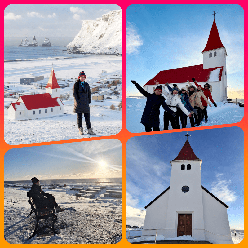 Next destination adalah Myrdal Church di Vik. Salah satu landmark yang populer di Iceland. Dibangun tahun 1930, gereja ini menghadap ke Samudera Atlantik dan pantai pasir hitam. Untuk bisa mendapatkan view yang cantik, kita perlu agak mendaki bukit, sehingga berada di bagian atas dan memandang gereja serta samudera di bagian bawah.