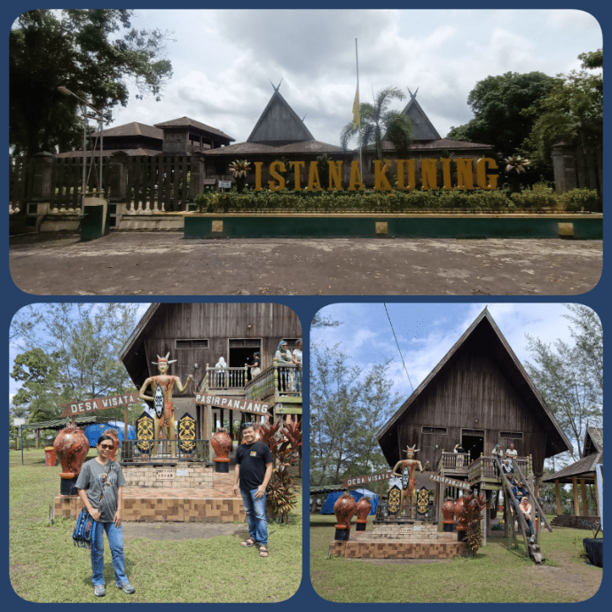 Pertama kami diajak belanja oleh2 makanan khas penduduk lokal sini seperti kemplang ikan, cumi dan lain sebagainya. Selesai belanja, kami menuju Desa Wisata Pasir Panjang. Di sini terdapat satu rumah adat panggung yang panjang. Tangganya dibuat mengecil dan rumahnya jauh dari atas tanah. Tujuannya untuk menghindari serangan binatang buas. Di dalam rumah tidak banyak interior atau perabotan. Ada salah satu tour guide yang memperagakan keahliannya menggunakan sipet, senjata tradisional suku Dayak, suku yang banyak tinggal di Kalimantan berupa buluh panjang untuk menembakkan panah ke hewan buruan