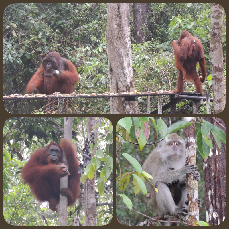 Akhirnya tibalah kami di tempat feeding orangutan. Terlihat ada beberapa ranger yang memberikan makanan dan juga menjaga aktivitas mereka selama para turis memperhatikan dan mengabadikan para orangutan. Pohon2 di sekitar dan seputaran atas kepala kami bergoyang ke sana sini pertanda banyak orangutan yang sedang santai2 duduk. Kayaknya mereka deh yang menonton kami.