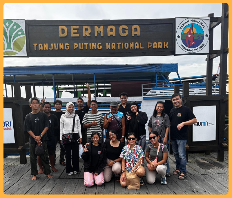 Hari terakhir kami di sungai Sekonyer. Pagi ini kami disuguhi sarapan berupa nasi goreng dan ada dessert berupa kue wadai pisang. Sebelum benar2 meninggalkan Taman Nasional Tanjung Puting, kami foto bersama di depan patung orangutan yang menandai gerbang masuk taman nasional ini.