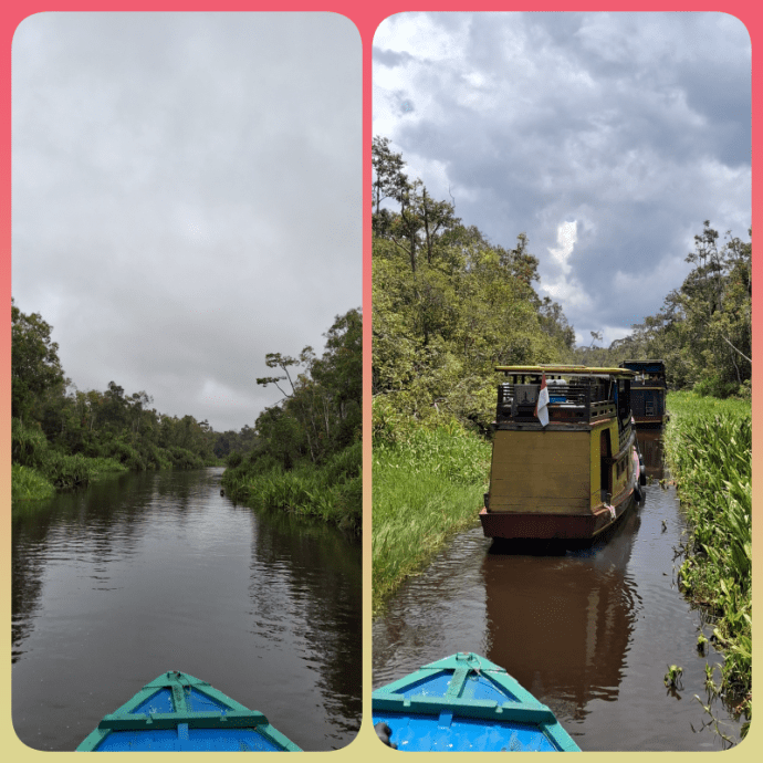 Semakin mendekati camp Leakey, hujan semakin besar. Perahu klotok yang kami tumpangi tertutup rapat oleh terpal dari berbagai arah. Tidak bisa melihat situasi di luar. Tidak lama kemudian, semua penumpang kapal klotok yang ada di perahu kami (termasuk kami dan tambahan dari perahu lain sebelumnya), dipindahkan lagi ke perahu lainnya. Ini artinya camp Leakey sudah semakin dekat dan tidak bisa menampung semua perahu.